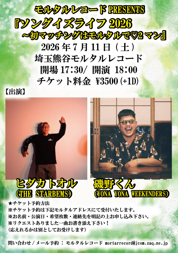 熊谷のインディーズSHOPモルタルレコードでの、恒例アコースティック2マンが、7月11日に決定!